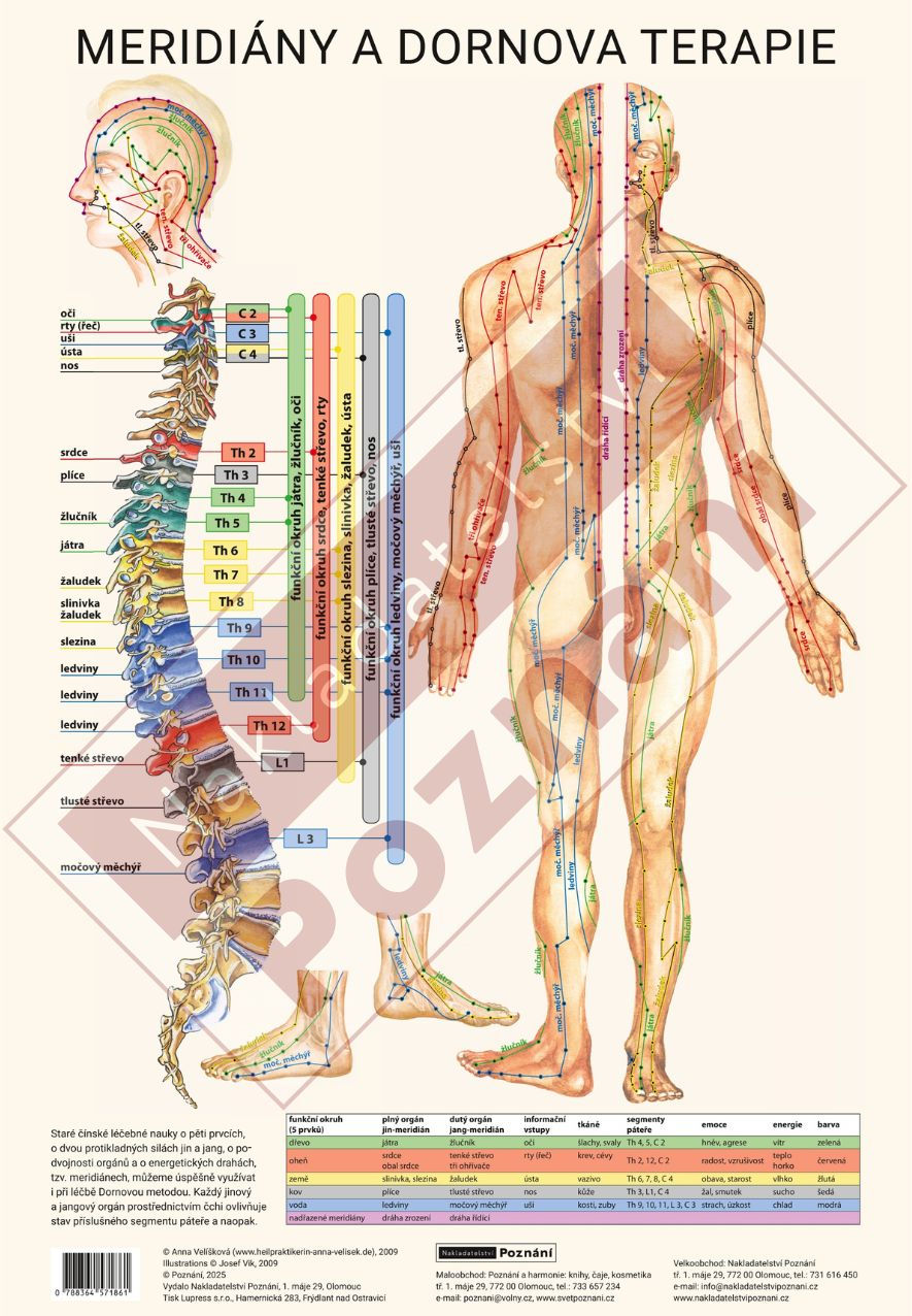 Barevný plakát zobrazující vztah meridiánů k jednotlivým segmentům páteře.